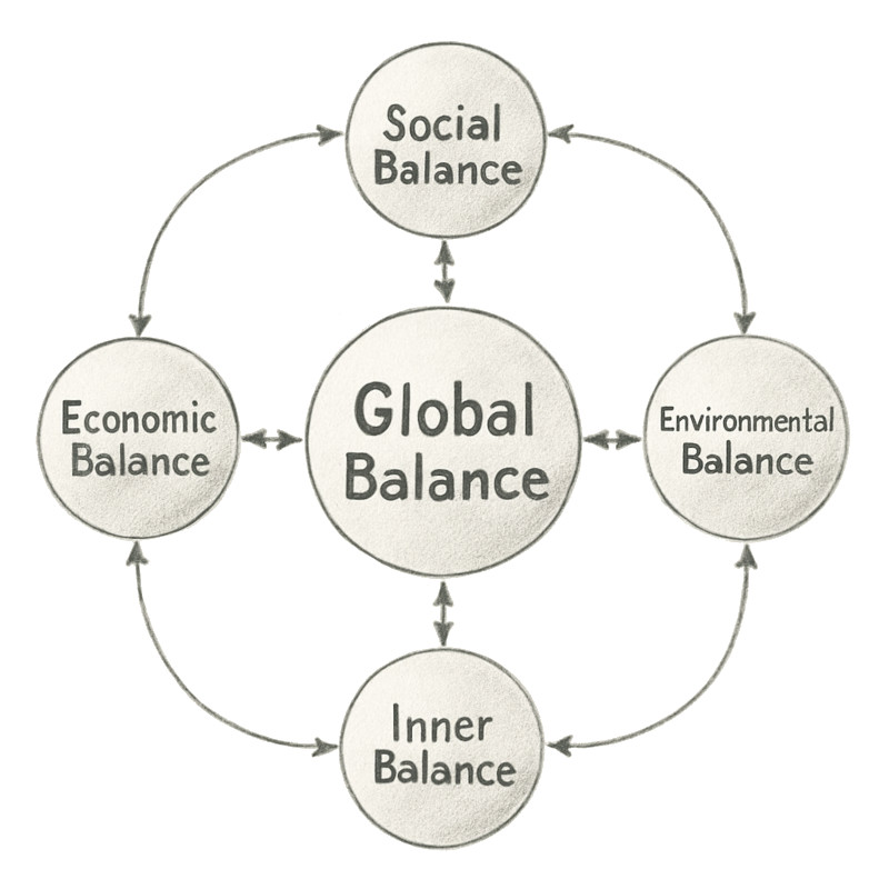We understand Global Balance as the process of balancing four interconnected dimensions. Each dimension influences the others, creating either virtuous cycles of holistic wellbeing or cascading imbalances.